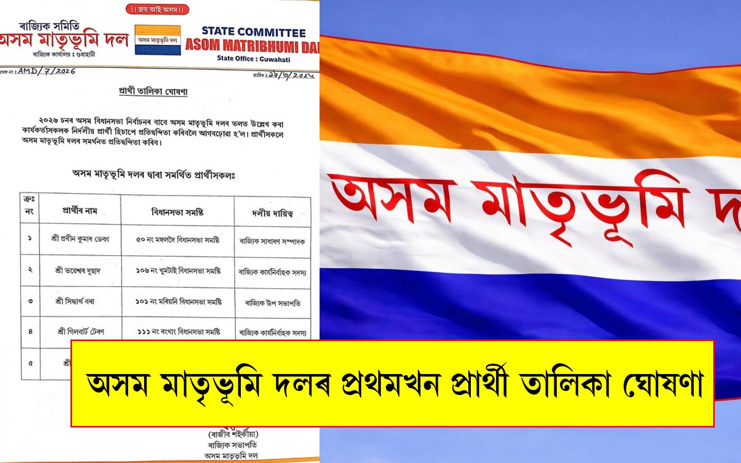 অসম বিধানসভা নিৰ্বাচন ২০২৬ৰ বাবে নৱ গঠিত অসম মাতৃভূমি দলে বৃহস্পতিবাৰে ঘোষণা কৰিছে পাঁচটা বিধানসভা সমষ্টিৰ বাবে প্ৰথমখন প্ৰাৰ্থী তালিকা৷