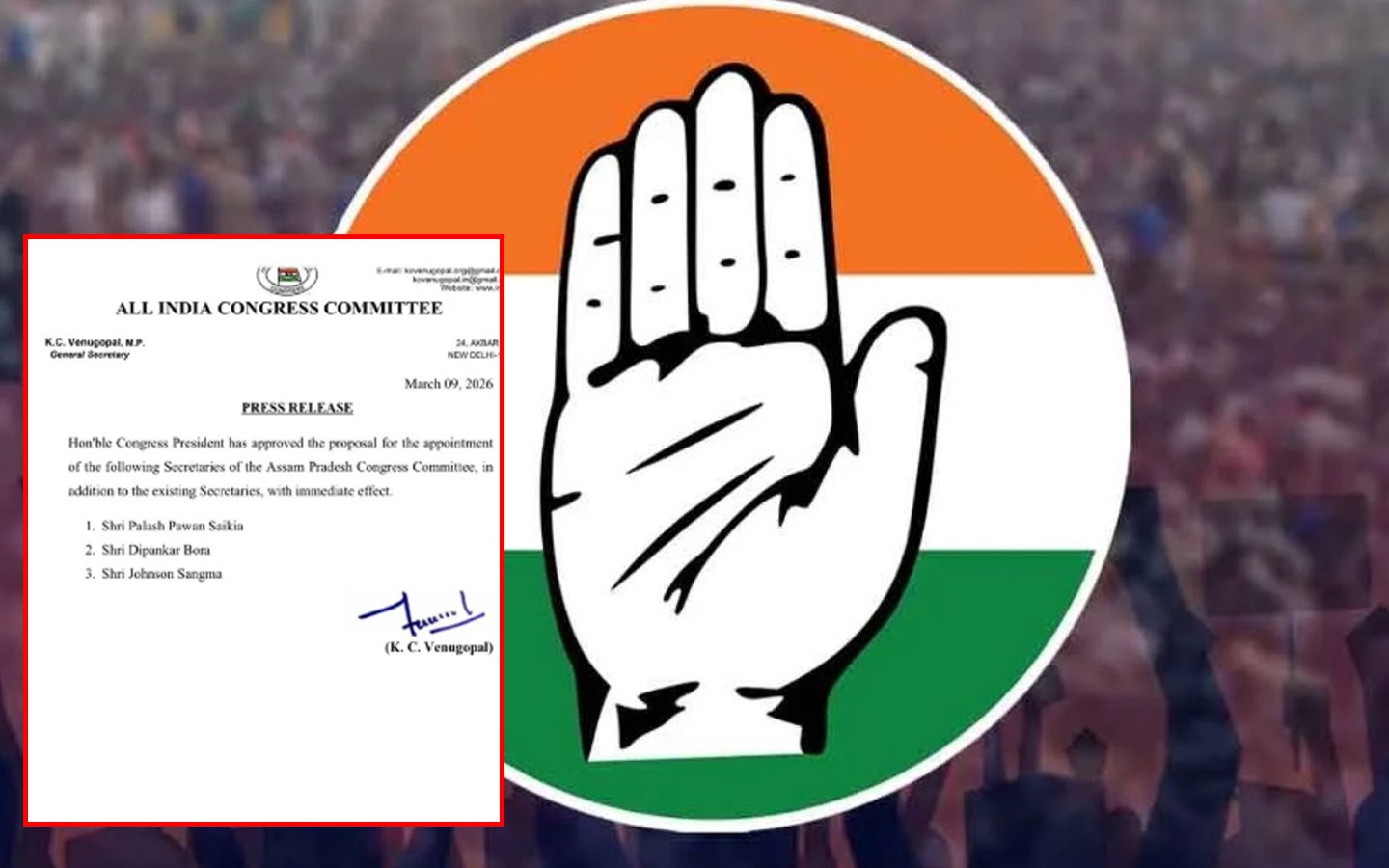 নতুনকৈ অসম প্ৰদেশ কংগ্ৰেছৰ সম্পাদক হিচাপে নিযুক্তি দিয়াসকল ক্ৰমে- পলাশ পৱন শইকীয়া, দিপাংকৰ বৰা আৰু জনচন চাংমা।