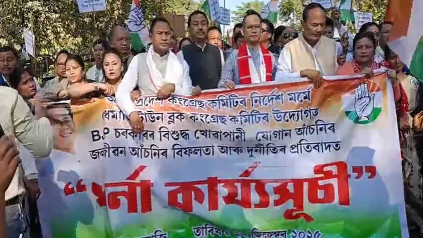 বিজেপি চৰকাৰৰ জলজীৱন মিছন আঁচনিৰ বিফলতা আৰু এই বিভাগটোত হোৱা ব্যাপক দুৰ্নীতিৰ প্ৰতিবাদত তৎকালীনভাৱে চি.বি.আইৰ তদন্তৰ বিচাৰি ধেমাজিত অসম প্ৰদেশ কংগ্ৰেছৰ সভাপতি গৌৰৱ গগৈৰ উপস্থিতত ধৰ্ণা কাৰ্যসূচী।