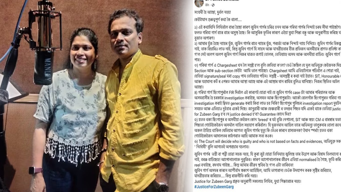তেওঁ লগতে লিখিছে, ‘‘জুবিন গাৰ্গৰ ভগ্নী বা পত্নী হোৱা সহজ নহয়, যিকুৰা জুই যোৱা তিনিমাহে জ্বলিছে তাৰ উত্তাপ আৰু বিষাদ তিলমানো কমা নাই, বৰঞ্চ বাঢ়িছেহে! আপোনালোকে নুবুজিব। কাৰণ আপোনালোকৰ জীৱন এতিয়া নৰ্মেলাইজড হৈ গৈছে, স্ফূৰ্তি কৰিছে, ৰীল বনাইছে, বদনাম গাইছে… কিন্তু আমাৰ জীৱন স্থবিৰ হৈ গ’ল এটা তাৰিখত! জুবিন গাৰ্গ অসমৰ কাৰণে আশীৰ্বাদস্বৰূপে আহিছিল, আমি ভাগ্যৱান! তেওঁক উদযাপন কৰক সৃষ্টিৰ জৰিয়তে, মানৱীয়তাৰ জৰিয়তে, কিন্তু ৰাজনীতি কৰি নহয়। Justice for Zubeen Garg প্ৰকৃত অনুৰাগীসকলেহে লিখিব, মুখা পিন্ধাবোৰে নহয়।’’