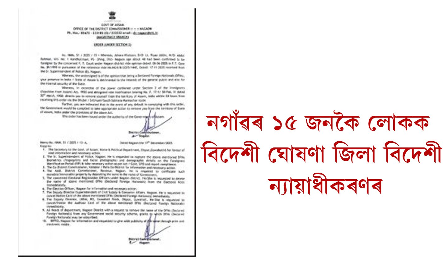 নগাঁৱৰ ১৫ জনকৈ লোকক বিদেশী ঘোষণা জিলা বিদেশী ন্যায়াধীকৰণৰ।২৪ ঘণ্টাৰ ভিতৰত ভাৰত ত্যাগৰ নিৰ্দেশ আটাইকেইজনক আজি বাংলাদেশ সীমান্তৰে কেউজনকে কৰা হ’ব প্ৰত্যাৰ্পন।